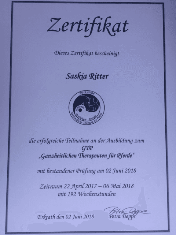 Im Juni 2018 habe ich meine Ausbildung zur Ganzheitlichen Therapeutin für Pferde abgeschlossen. Zu meinen weiteren Aufgaben, abgesehen vom Training von Reiter und Pferd gehören nun auch das Gesund Erhalten vom Freund und Partner - dem Pferd.